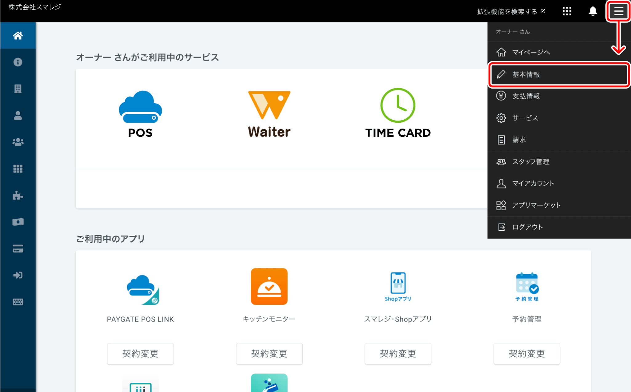 『管理画面右上の【≡】 > 基本情報』をクリックします。 -