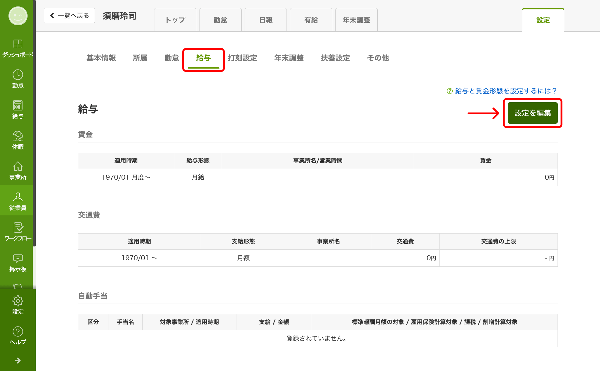 『月給』または『給与直接入力』の給与形態が適用されている場合、基本的に編集は行ないません