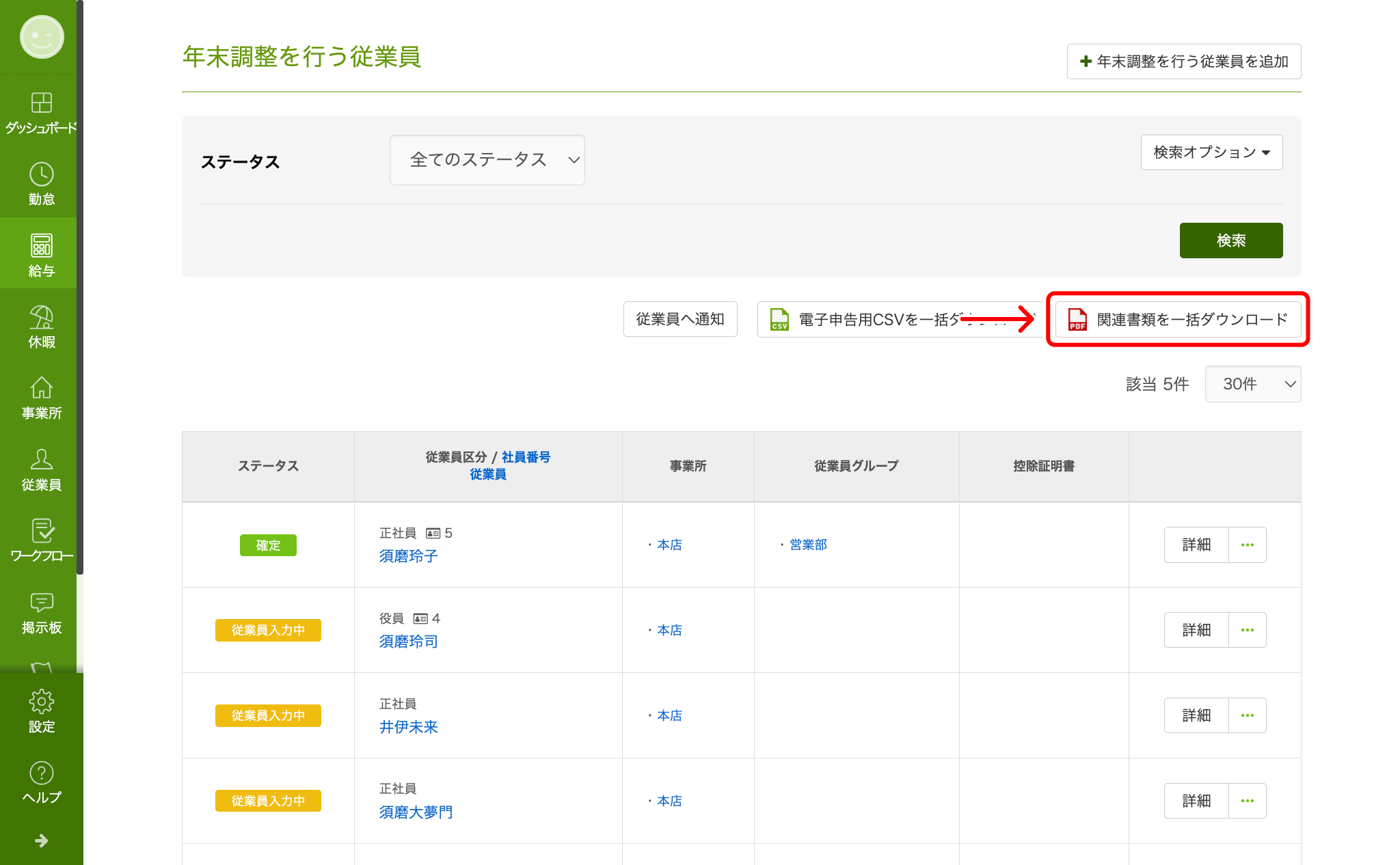【関連書類を一括ダウンロード】をクリックします。※ 年末調整のステータスが『完了』でない従業員は、一括ダウンロードの対象外となります -