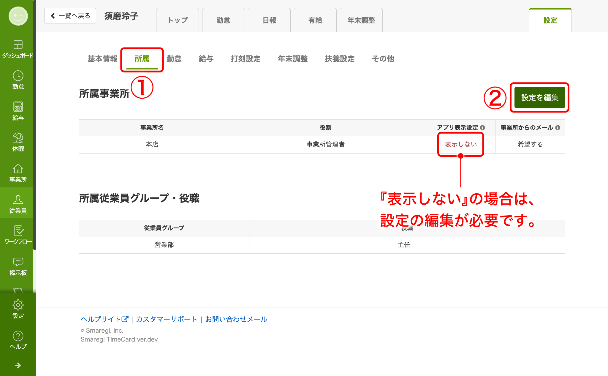 該当従業員の事業所のアプリ表示設定を『表示する』にする